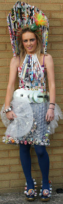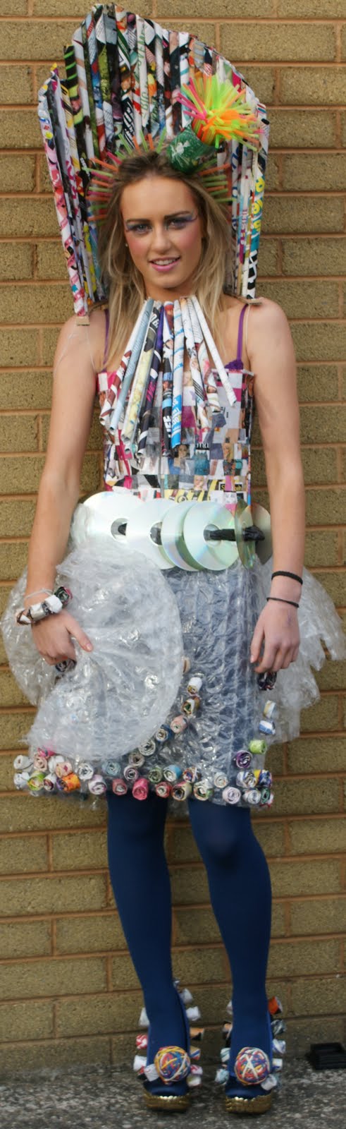 On… Junk Kouture 6 Replies On the weekend I caught up with my niece, Lisa, who is 15 and lives in Dublin. She showed me some photos of an awesome outfit she and a friend designed and made themselves. They came runner-ups in a design competition called ‘Junk Kouture’. The outfit is titled ‘Party in the USA’. How cool is it?! I would totally wear the shoes. The dress is made from woven, rolled and taped magazine pages. It’s dramatic but totally intricate. The shoes have hundreds of thumb-tacks in them and those huge pompoms are rolled up rubber bands. If I was the kind of smart person who analyzed art, I’d say this was a bold, witty statement about the impact of celebrity magazines on fashion and pop culture, and the disposable nature of tabloid journalism. Only I’d probably say it better than that. Because I’d be smart. What do you think?